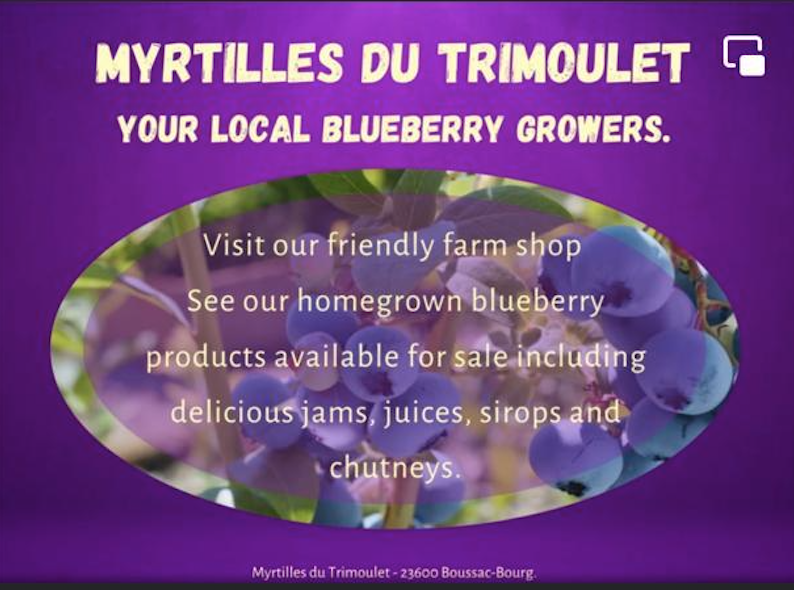 Pour ceux d’entre vous qui aiment les myrtilles ou qui sont intéressés par les petits kilomètres alimentaires, pourquoi ne pas faire un saut à la myrtille Myrtilles du Trimoulet, juste de l’autre côté de la Creuse, près de Boussac.